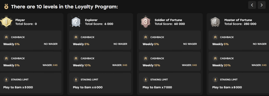 Vår lojalitetsstege är inte bara ett namn; det är en väg till betydande ekonomiska fördelar. Programmet består av 10 nivåer, från ”Player” till den mytomspunna ”Platinum Card”-statusen.